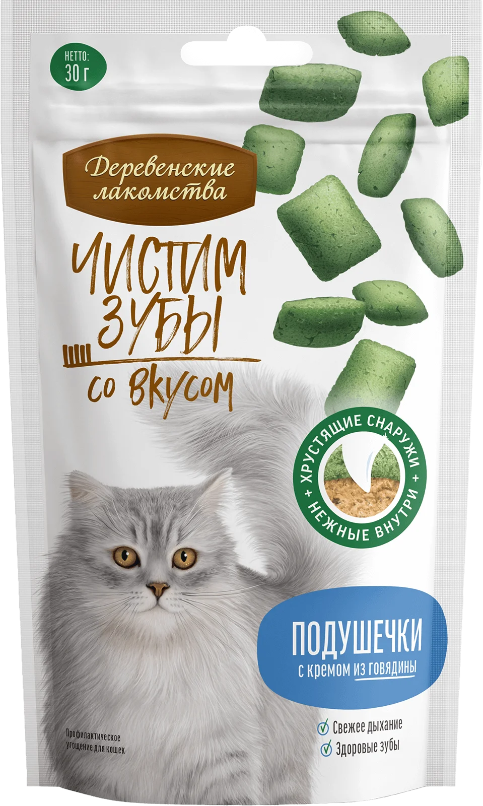 Хрустящие подушечки с кремом из говядины, благодаря своей пористой структуре, удаляют зубной налет, предотвращают образование зубного камня и освежают дыхание. Начинка из нежного мясного крема делает их любимым угощением кошек. Теперь чистить зубы не только просто, но и вкусно!Состав: злаки, белок растительный, говядина, яичный желток, мука рыбная, молотая креветка, растительное масло, картофель, фрукты и овощи (семена граната, клюква).