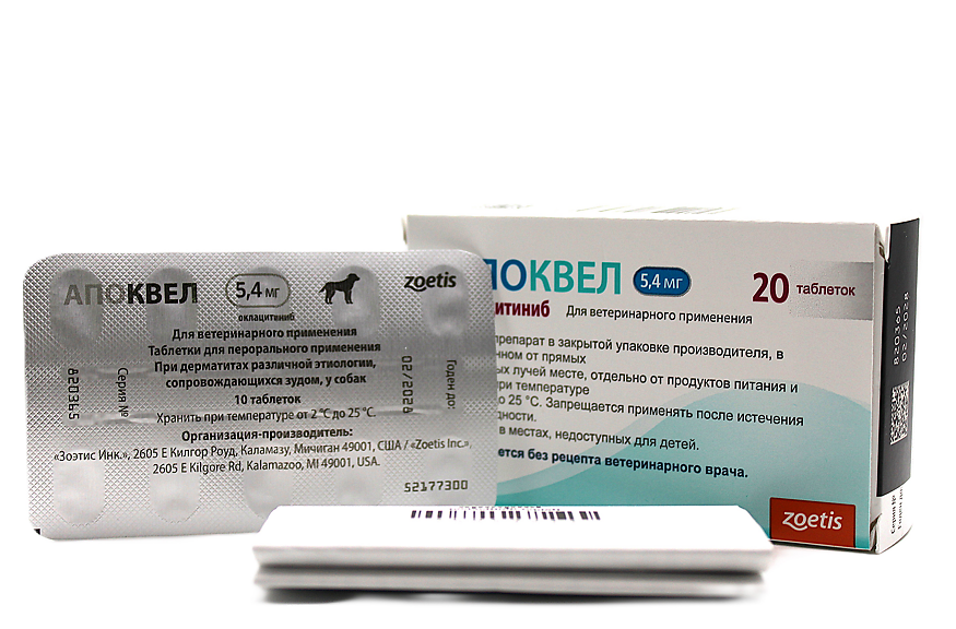 Апоквел назначают собакам при дерматите, ассоциированном с аллергией (контактный, пищевой, паразитарный) в целях устранения зуда и уменьшения очаговых изменений кожи, а также для профилактики рецидивов атопического дерматита.АПОКВЕЛ Противопоказанием к применению Апоквела является индивидуальная непереносимость животным его компонентов. Не допускается применение препарата собакам, с признаками иммуносупрессии, такими как гиперадренокортицизм, а также собакам, с прогрессирующими злокачественными новообразованиями.Не следует применять препарат кобелям в период вязки, собакам моложе 12-месячного возраста и/или массой менее 3 кг, а также щенным и кормящим сукам.Апоквел применяют собакам перорально индивидуально с руки, или в смеси с кормом, или вводят принудительно в пасть в разовой дозе 0,4-0,6 мг оклацитиниба на 1 кг массы животного два раза в день, не более 14 суток;в качестве поддерживающей терапии при атопическом дерматите — один раз в сутки в той же дозе, но не более 14 недель.